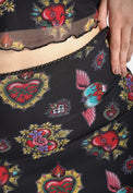Black base fabric with colourful heart illustrations.