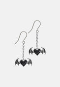 A miniature pair of antiqued pewter bat-winged, black enamel heart earrings.