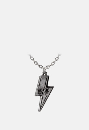 Antiqued pewter AC/DC flash logo pendant etched with the 'PWR UP' Logo.