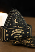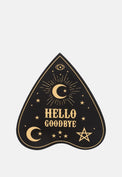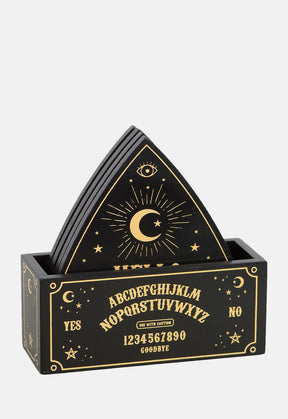 A set of 4 planchette shaped coasters with talking board design