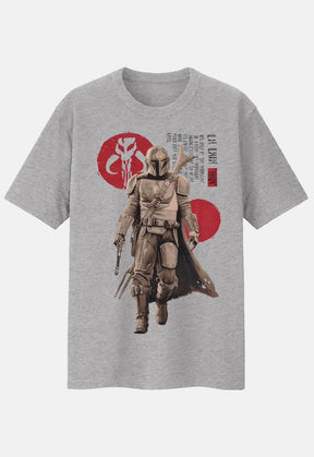 Features The Mandalorian and text printed on the front.