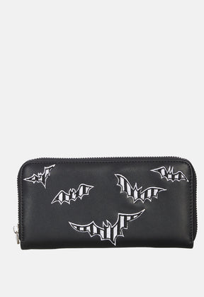 Wallet with embroidered bats detail.