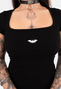 Embroidered bat motif across front