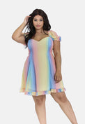 Fit-and-flare mini dress in a gorgeous pastel ombre rainbow print.